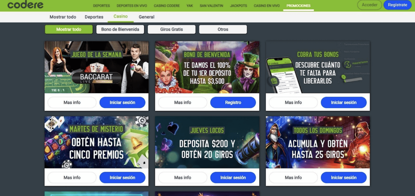 Al entrar, encontrarás links que te redirigirá a las secciones de casino, salas yak, jackpots, mesas en vivo y promociones, también están ubicados los iconos de acceso y registro.