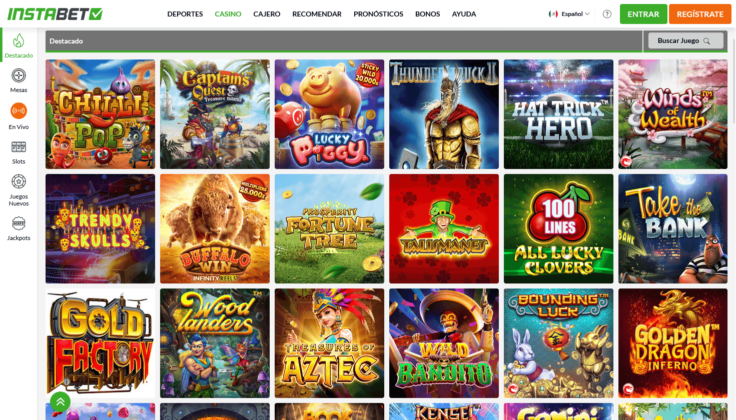 En la sección de casino de Instabet México hay un aproximado de 140 juegos. Tienes a disposición una gran variedad de tragamonedas, keno, rasca y gana, mesas en vivo, blackjack, baccarat, craps, video póker, ruleta y juegos con jackpots.